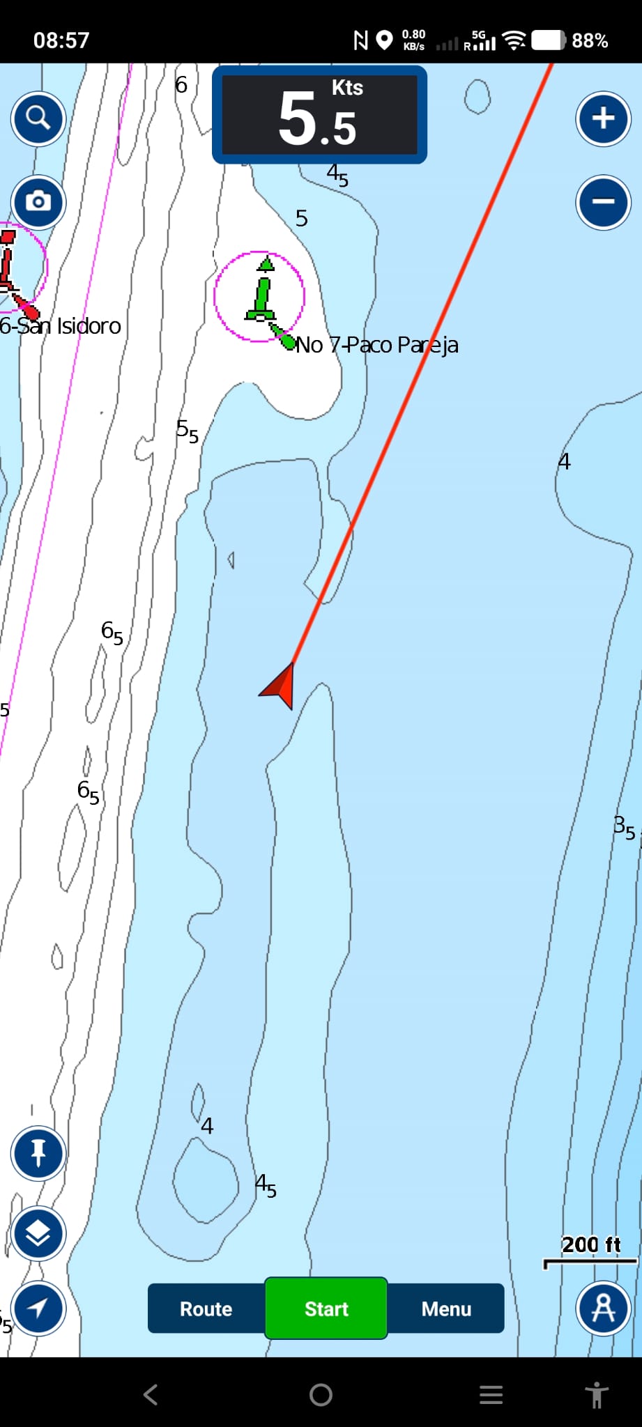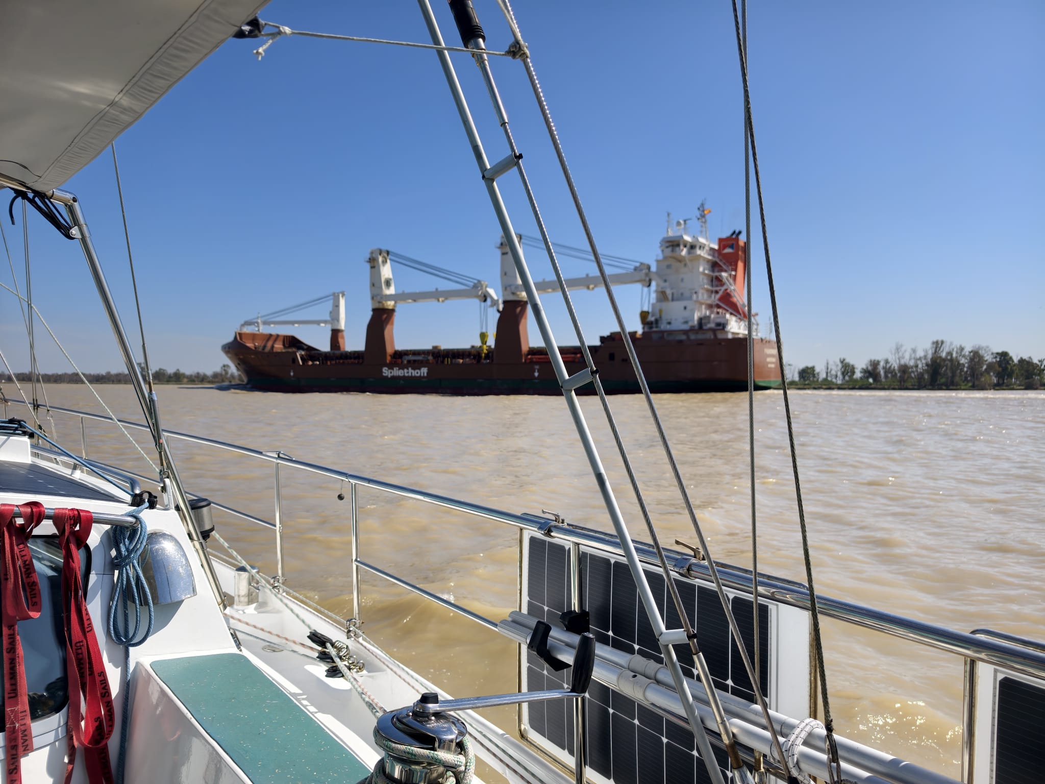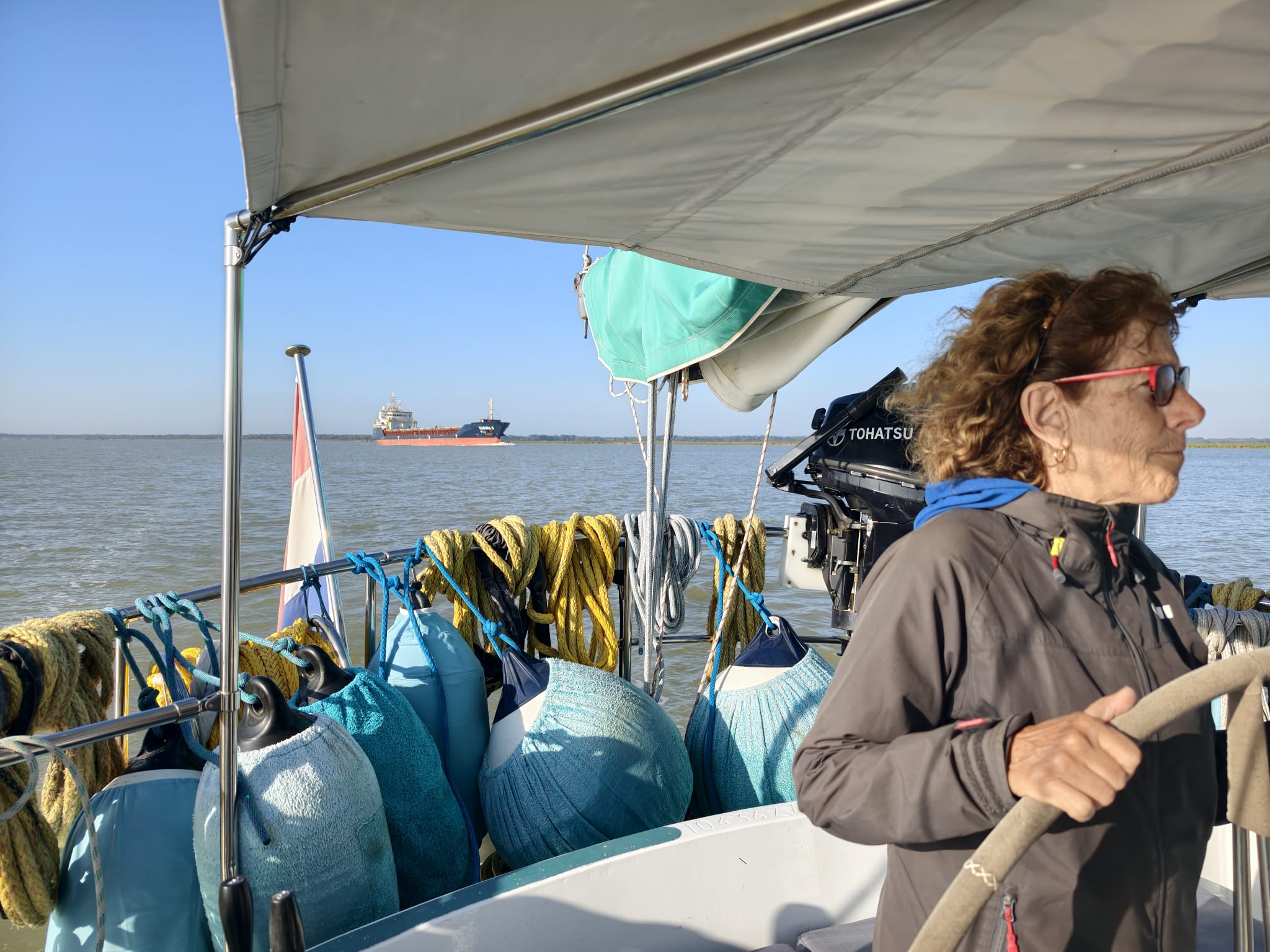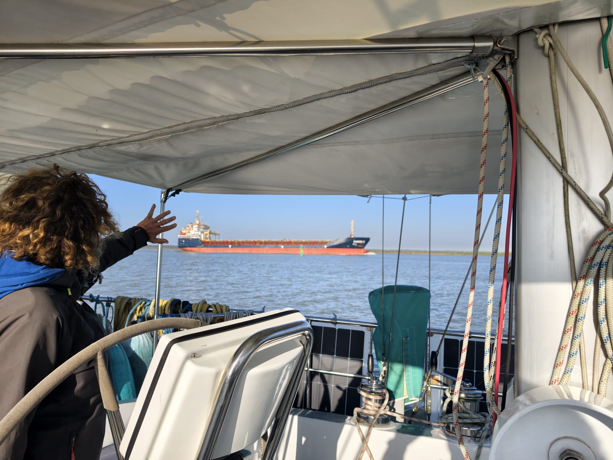 On the VHF, we are called by a pilot on board of a cargo vessel that approaches behind us. The channel is narrow here and they need to be in the middle because of their draft. He requests us to sail outside the buoyed channel. We move to the right side and we still have 5-6m of depth. The cargo vessel passes with a big wake that makes us roll.