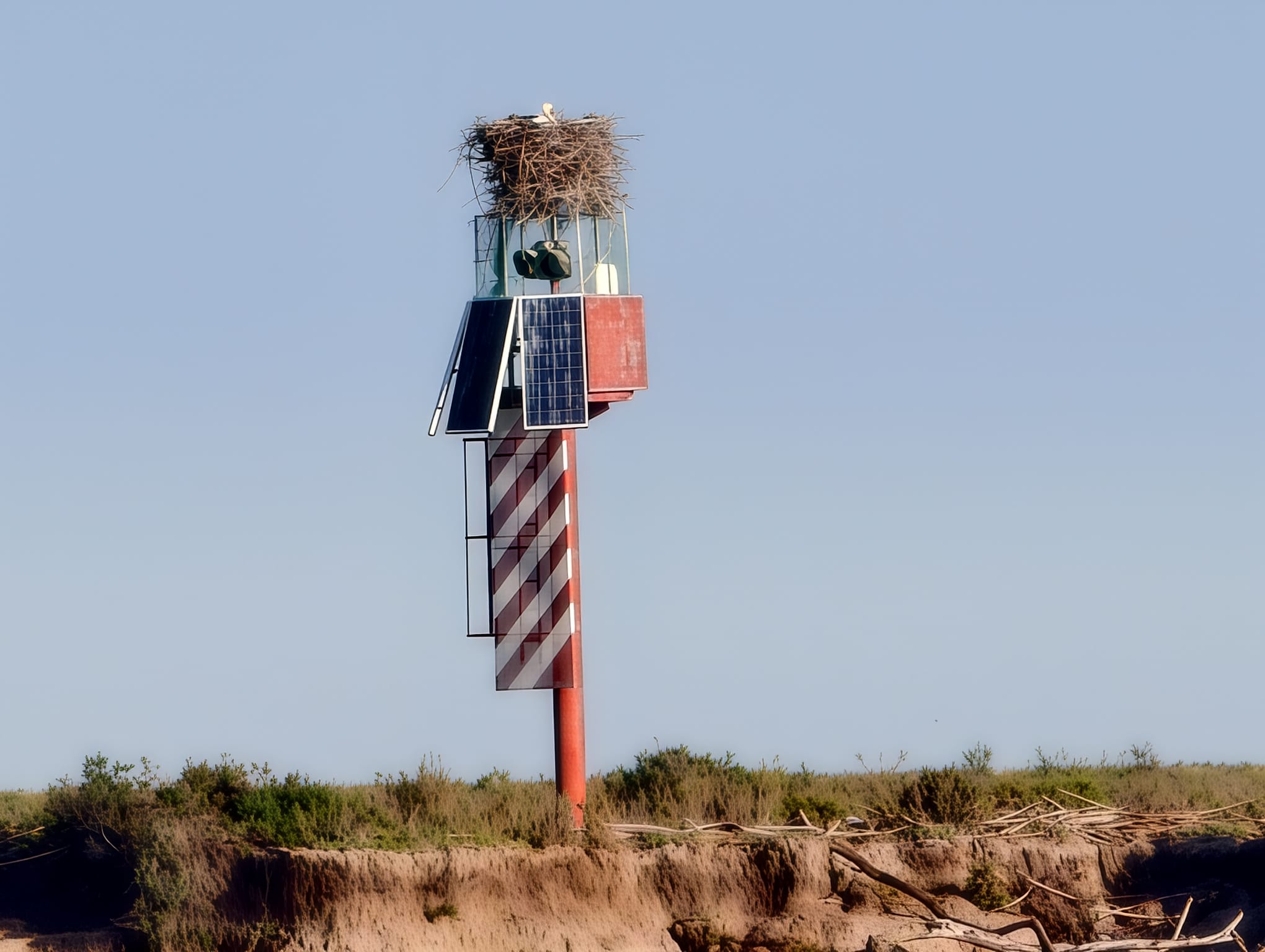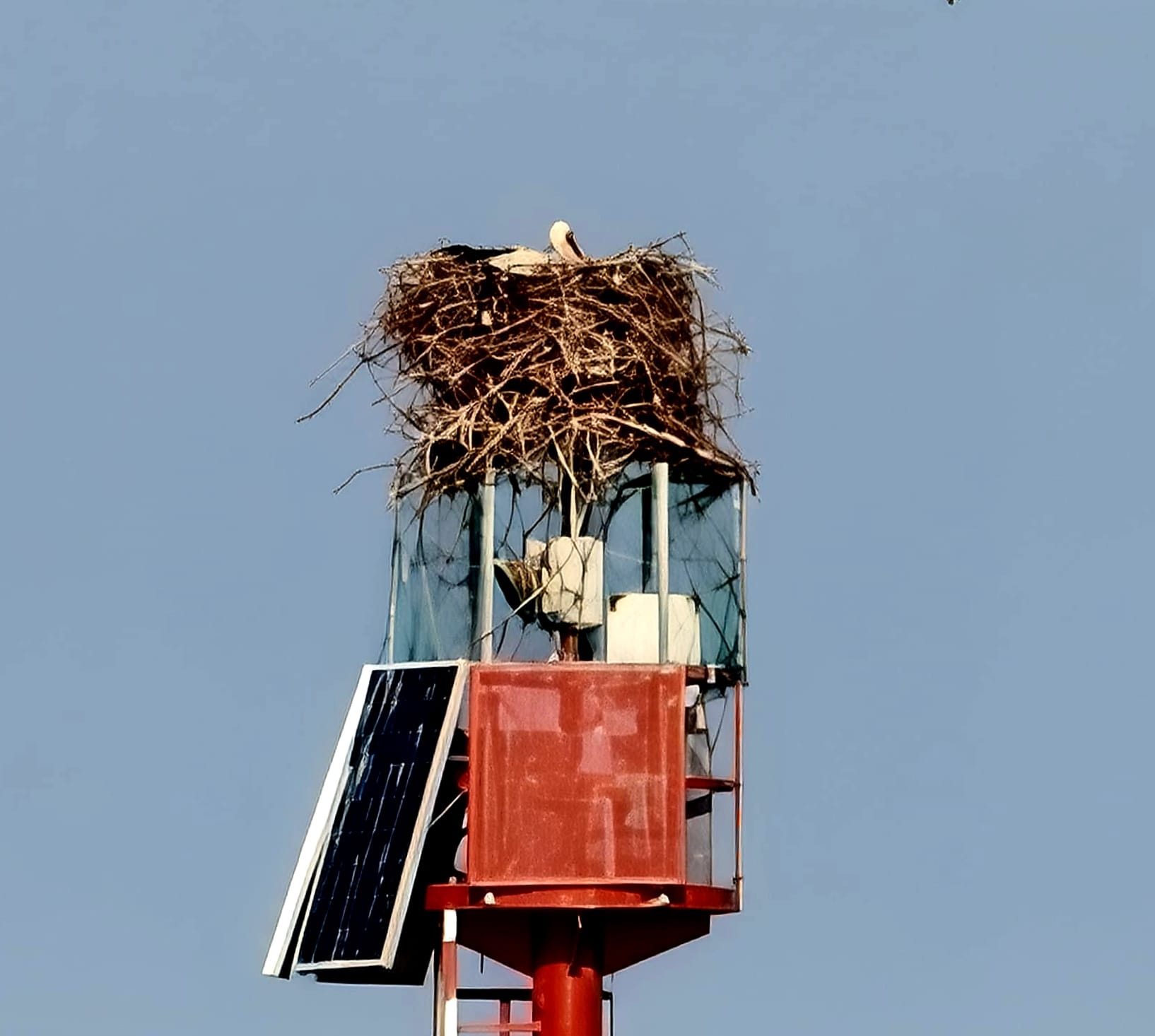 On the VHF, we are called by a pilot on board of a cargo vessel that approaches behind us. The channel is narrow here and they need to be in the middle because of their draft. He requests that we sail just outside the buoyed channel. We move to the right side and we still have 5-6m of depth. The cargo vessel passes with a big wake that makes us roll. Stork nests everywhere! Even on the guiding lights ๐