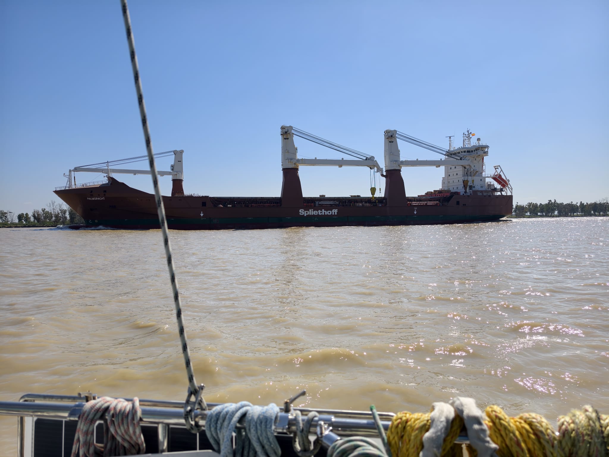 Another call from a big heavy lift vessel that want to overtake us. Yes, we’ve seen you and we’ll move to the side. But the river is really narrow here. The pilot advises us to go to left side, outside the red buoys and reduce speed until they have passes. It’s a small area where the river widens a bit but it’s shallow area and after this, the river gets very narrow. We hover in this area with the engine idling. We see the big boy coming at a speed of 12 knots with a huge wake. Because there’s not so much water here, the wake breaks behind their stern. We prepare for a big blow! But when the pass us they reduce speed to 7 knots and have almost no wake! They blow their big horn as a thank you. How nice! Then, they throttle up again with a big black cloud from their exhaust.
