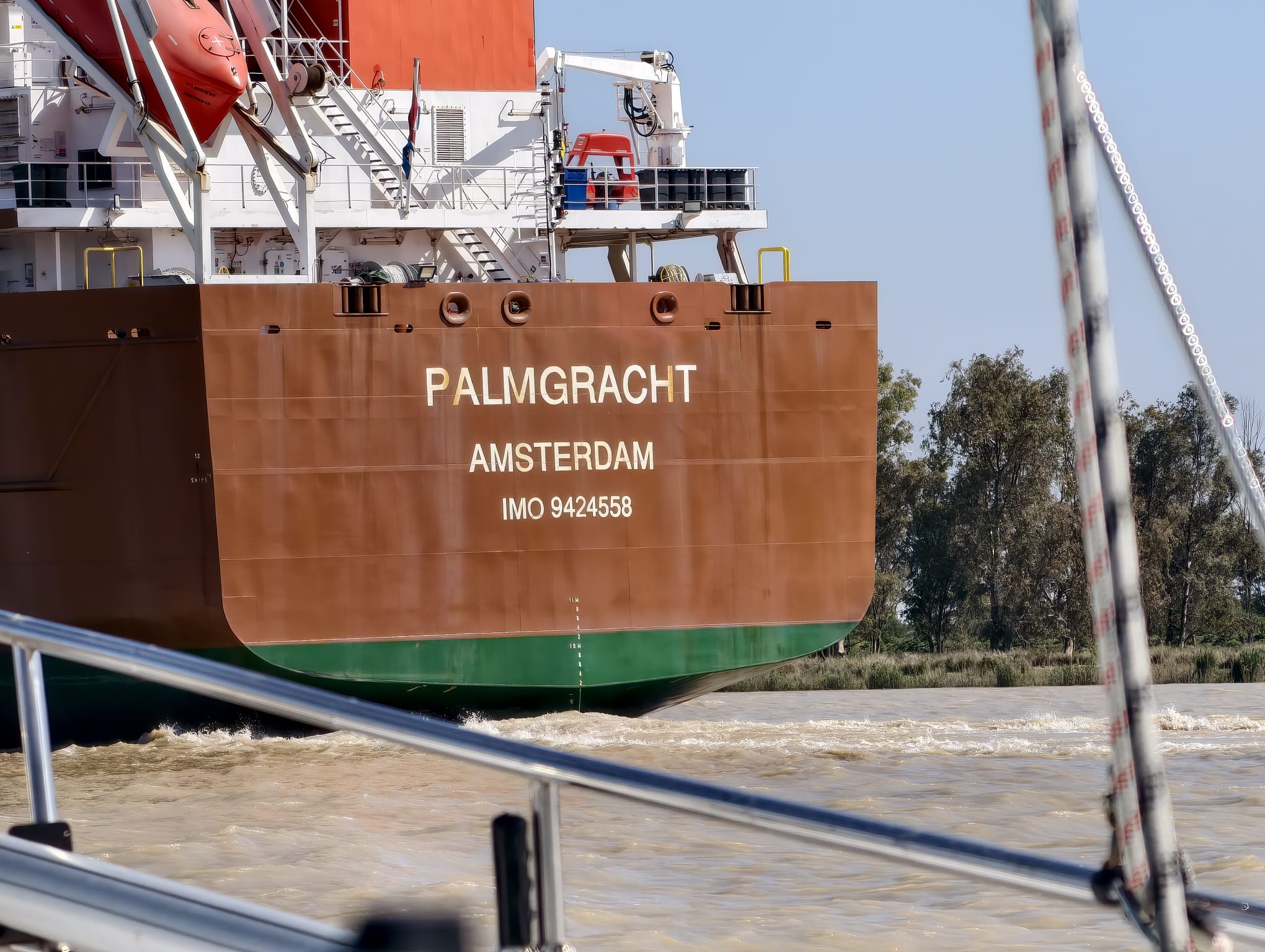 In the port, we pass the same vessel (from Amsterdam) that did pass us on the way here. The pilot calls us: “Dione IV, please speed up. We’re being pulled from the shore.” We throttle up Mighty Mitsu to 1800 revs and with a speed of 7 knots we make way for them.