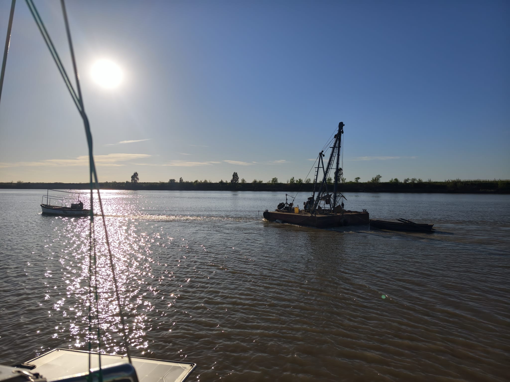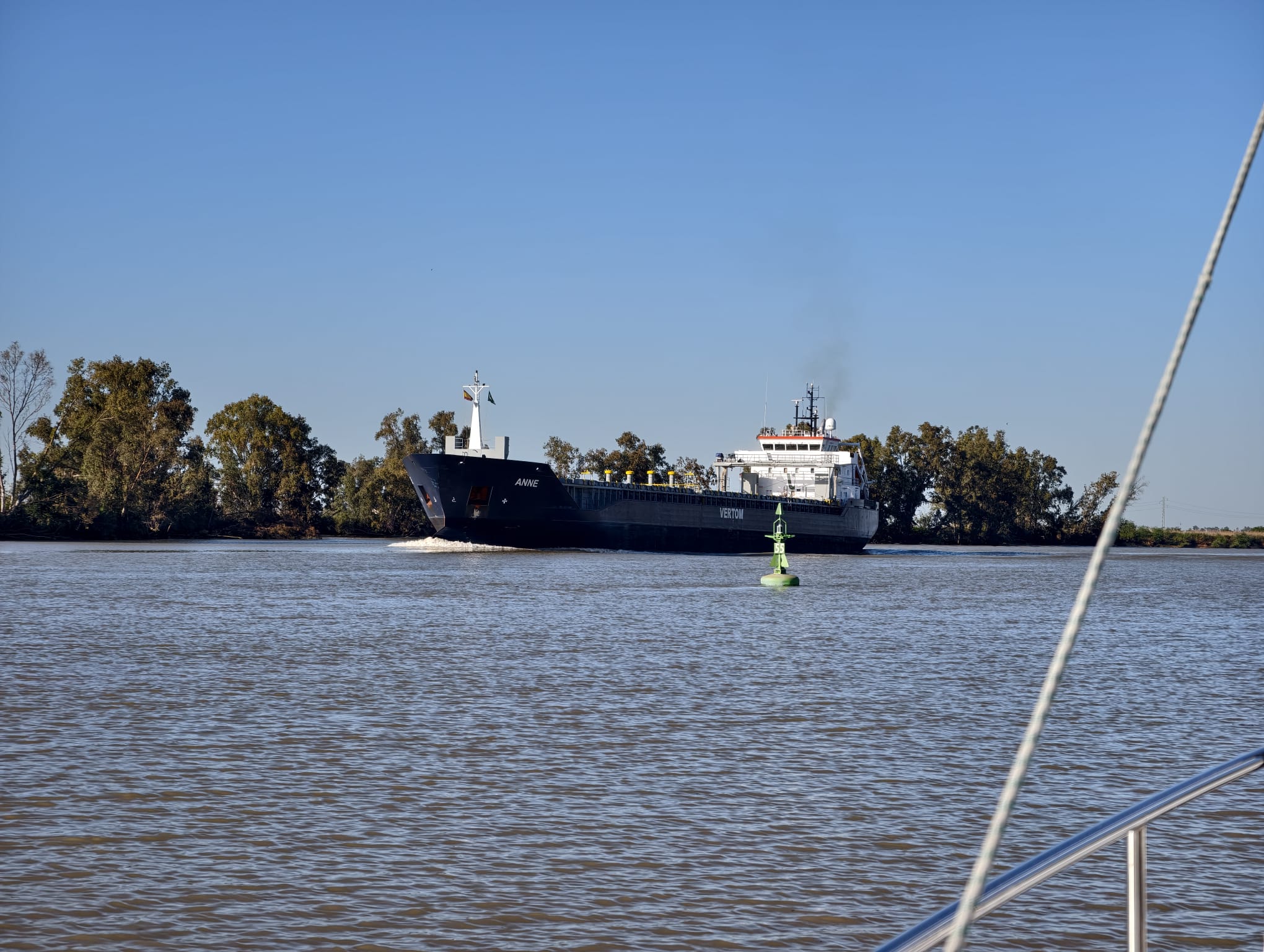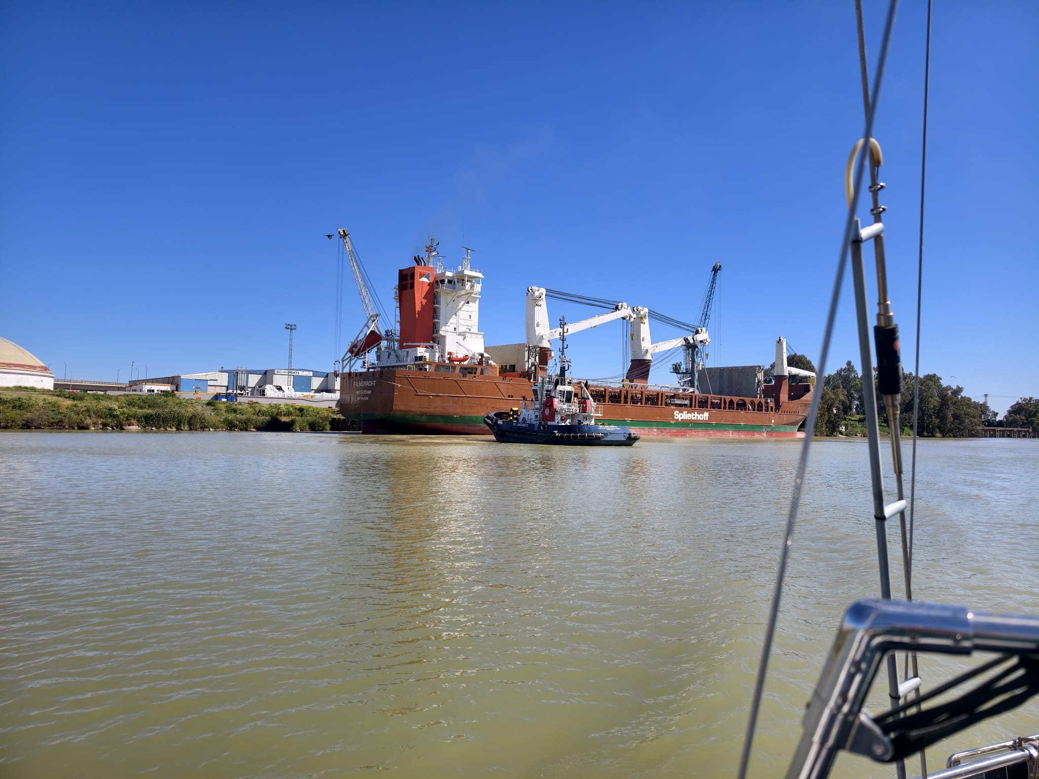 We wait till the current turns around and at 1100h we lift our anchor. It has buried deep! The windlass pulls the bow down to pull it out of the clay. Here we go, the last miles to Sevilla.