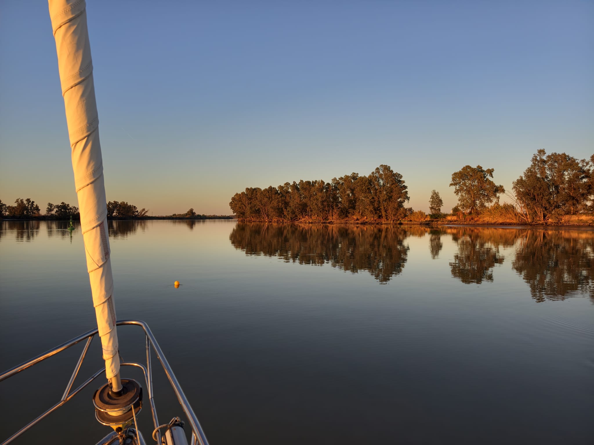 At 23300h, Wim wakes up from sounds of the anchor chain. He gets out of bed and checks outside. There’s current up river and wind from the same direction. He looks at the speed-through-water transducer reading: about 2 knots. About 10-15 knots of wind from the same direction (from the south). That should pull us neatly straight behind our anchor and the chain shouldn’t make noise. The chain is sometimes noisy when wind and current are in opposite directions but that’s not the case now. So, he decides to check outside, on the bow, and dresses.