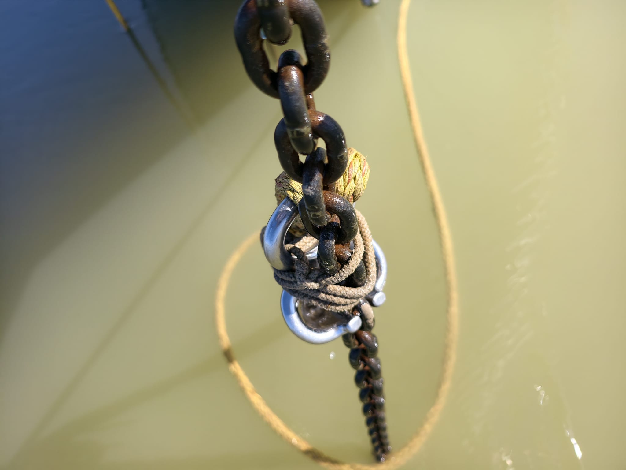 At the bow, he notices that the chain and the bridle are both stretched firmly. Hm. The bridle (the lines from the chain hook to both forward bollards) should be carrying the force of current and wind but the chain should be hanging loosely. He hoists some of the chain to inspect the chain hook. What?? The hook has come loose! It’s opnposite of the chain. And the only thing holding it is the rope that should secure the hook onto the chain. Here’s some pictures (from the next morning) of how the chain hook is attached to the chain.