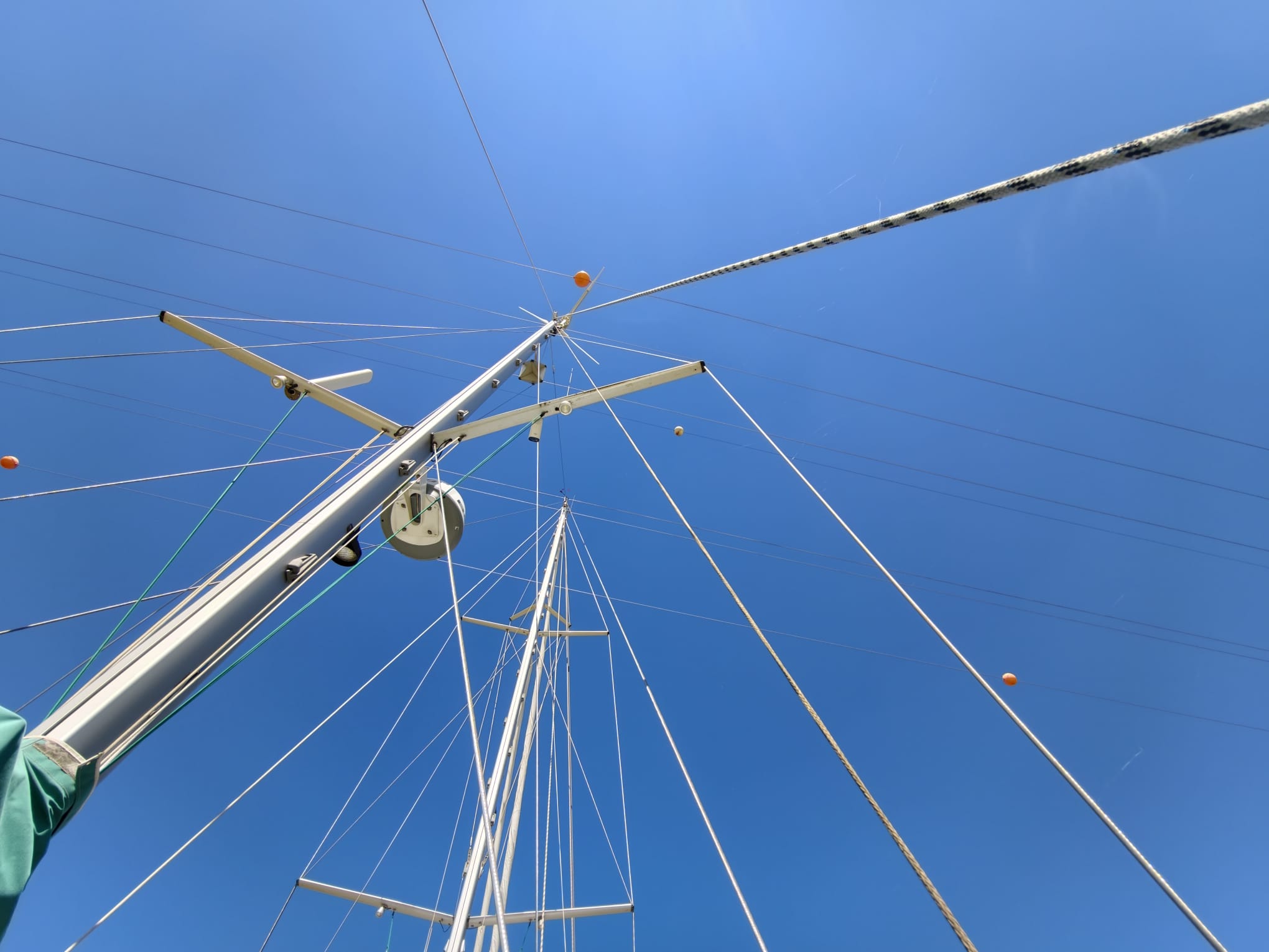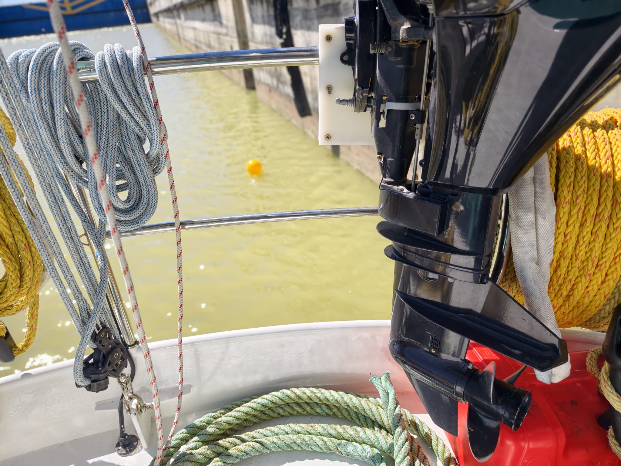 Sher hold Dione IV in position with the engine while Wim hoists the anchor. Bloody hell, when the anchor is just below the waterline it gets stuck! Wim can’t hoist it any further because the retriever line holds it. The line + yellow ball must be stuck somewhere! In the propeller?? Hm. There was 10m line on it…Could that reach the prop? ๐ค. We have propulsion on the engine so there seems to be nothing wrong with the prop.