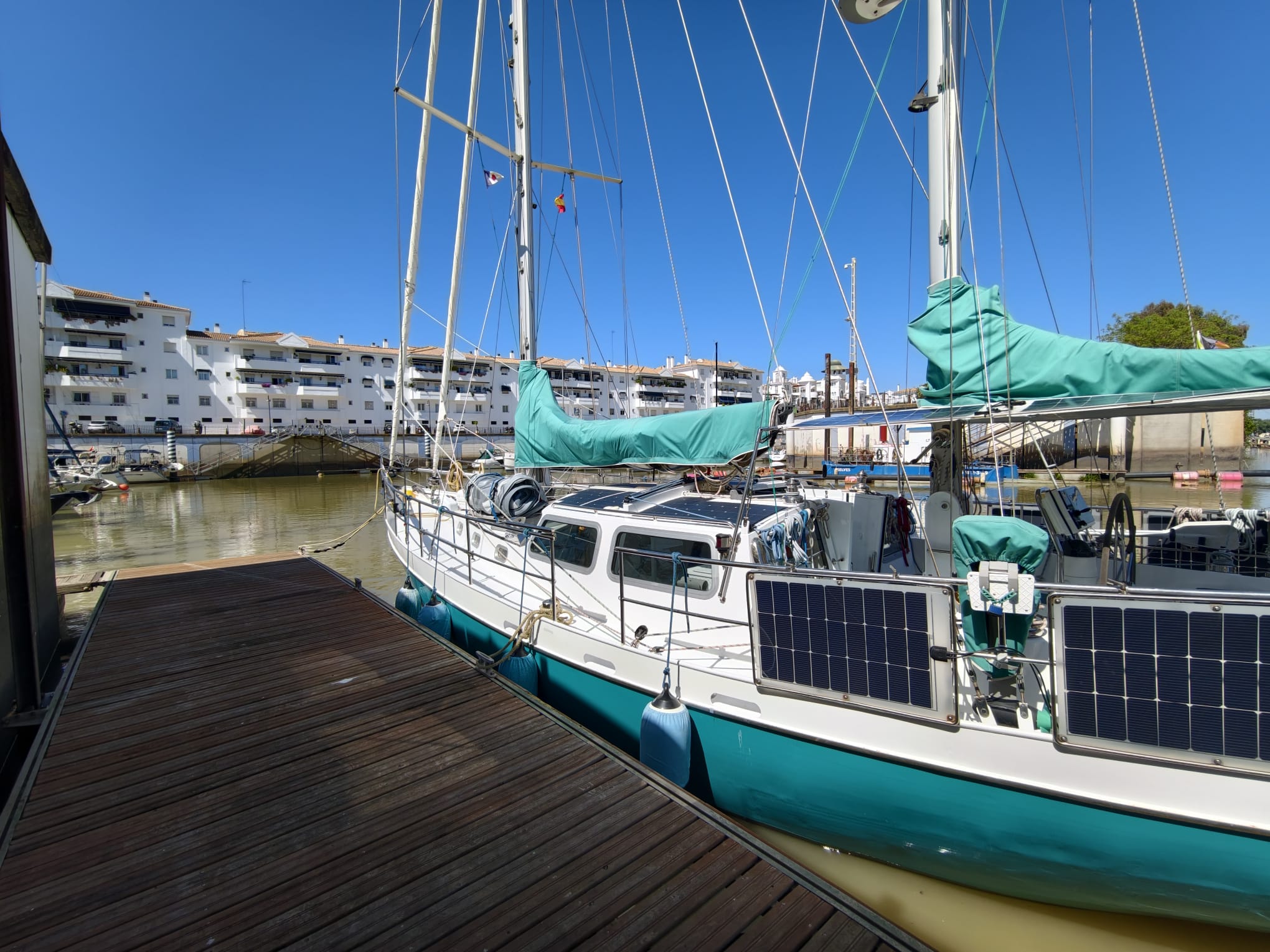 The marina is right after the bridge and a marineiro is already waving at us. We moor Med-style, with the stern to the pontoon and a mooring line at the bow.