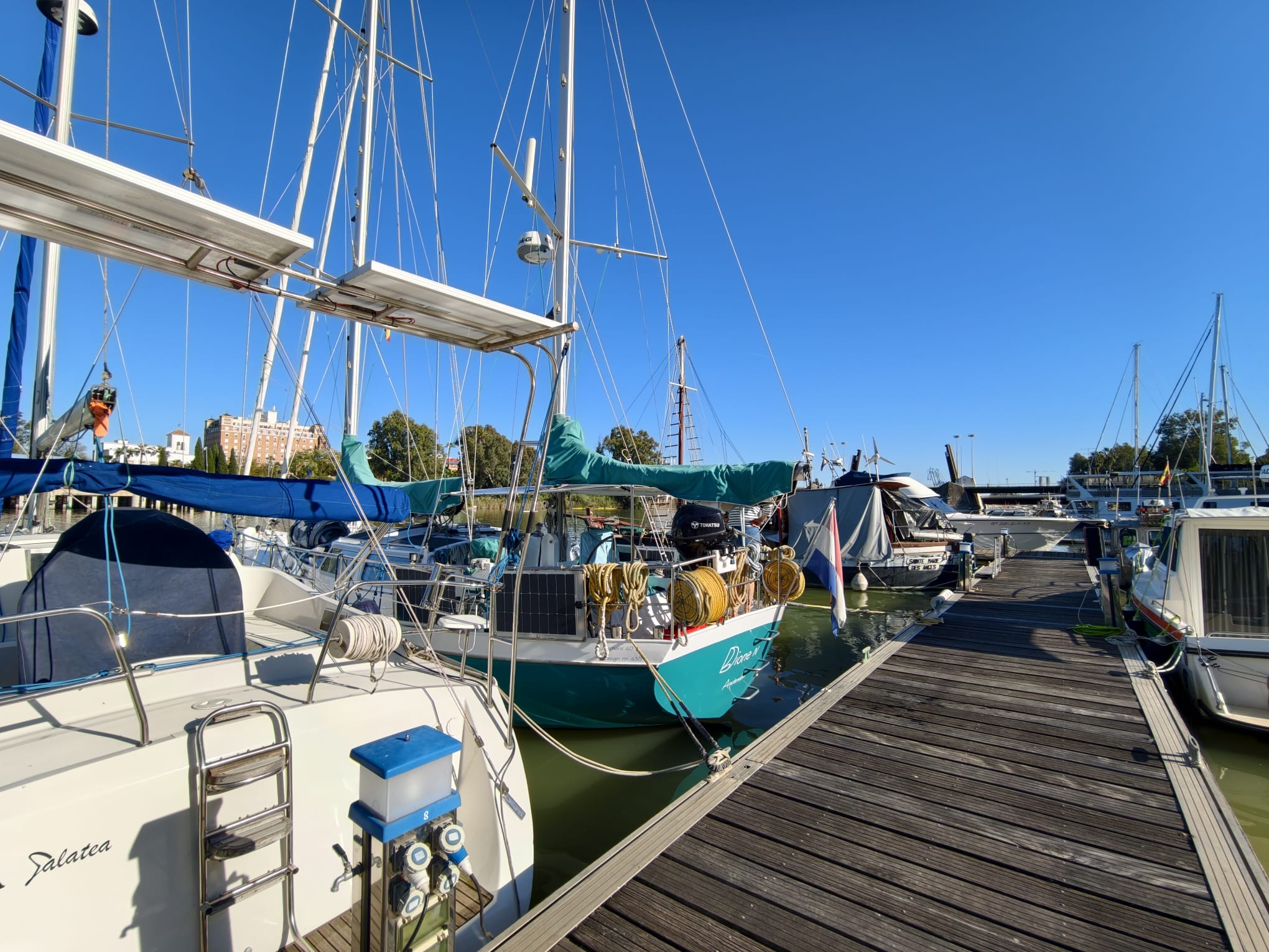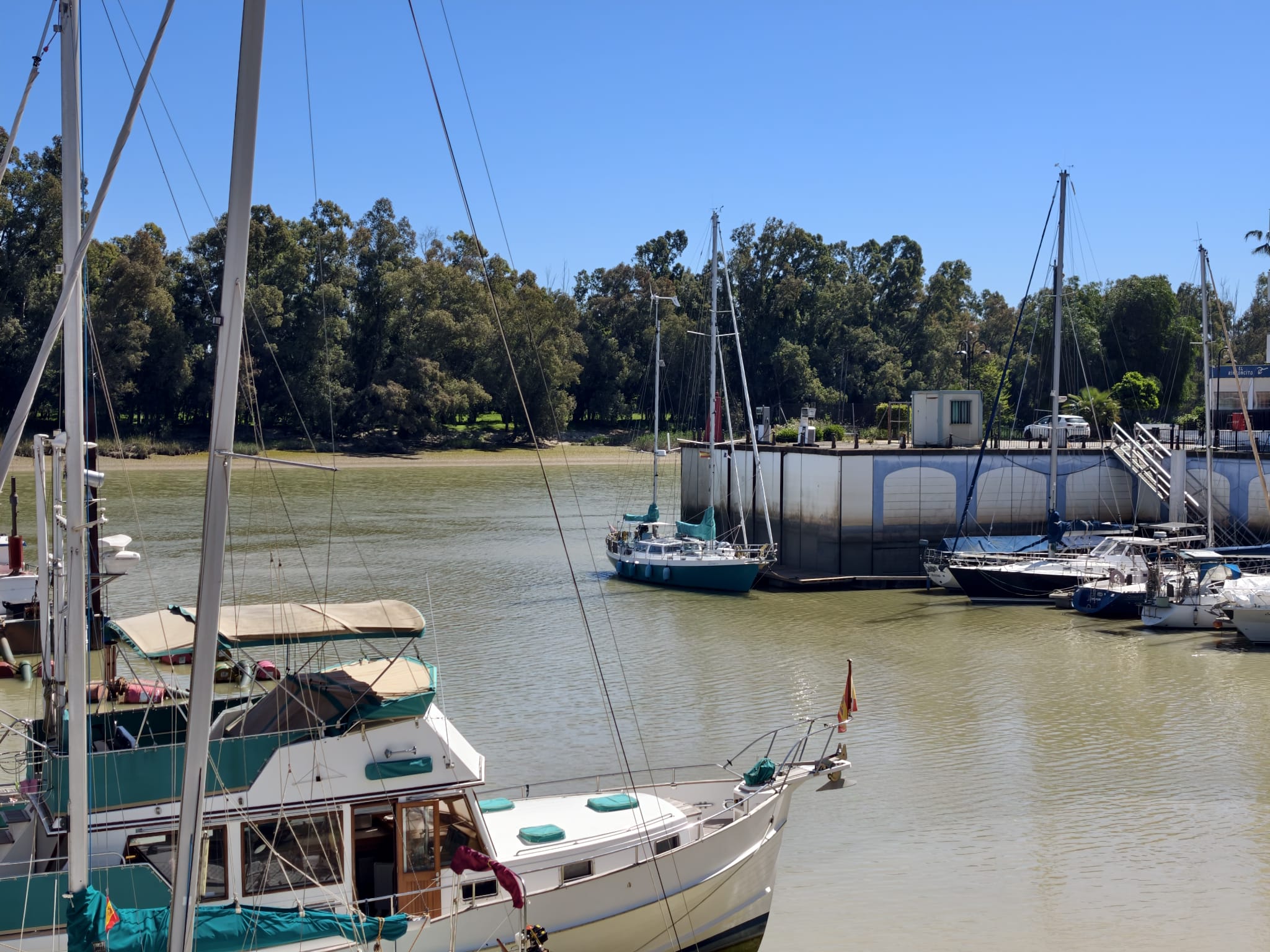We have an appointment for Monday afternoon to go through the lock and the bridge to enter Sevilla so we have 2 days to spend. We expected to do some stops along the way but there were no suitable anchor spots so we’re ahead of schedule now. For Sunday, there’s a forecast for a lot wind and we don’t like idea of being anchored in strong currents with 20-25 knots of wind. When wind and current are in opposite directions that isn’t comfortable. So, Sher calls the little marina in Puerto Gelves. We are welcome there.