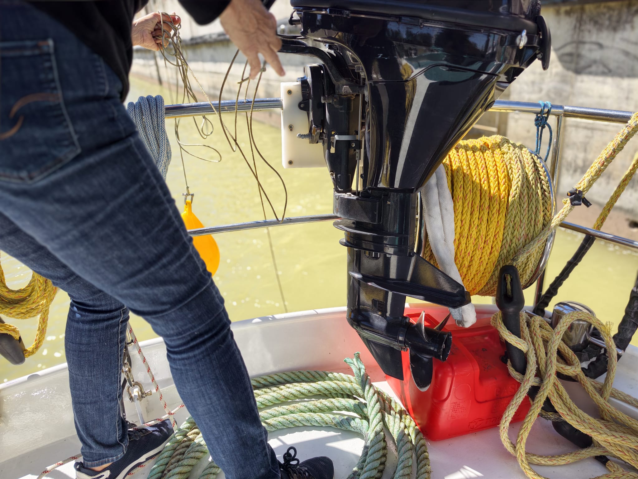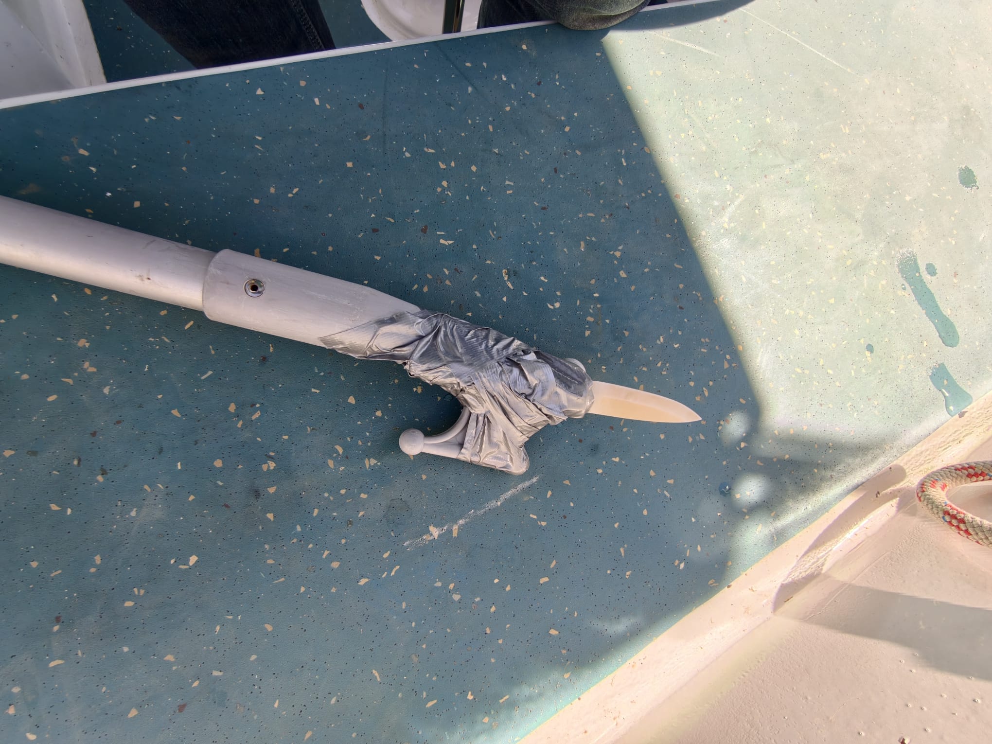 We have to cut the retriever line. Wim tapes a ceramic knife to the boat hook and cuts the line.