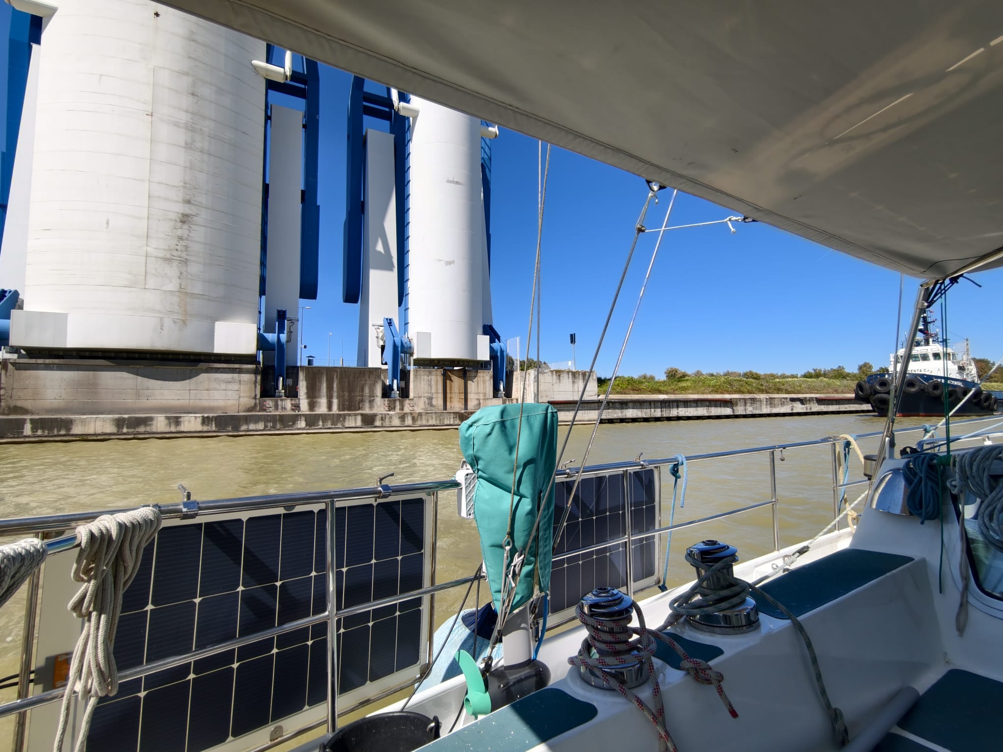 At that moment the lock calls us on the VHF. They must have seen our AIS signal. A lady says: “Hello Dione IV, we have your appointment at 1700h but since there’s a big cargo ship approaching we’d rather have you now. Please come into the lock.” All right, that’s better, we think, we don’t have to re-anchor then. But we have to hoist the anchor. We’re not going to sail with the anchor in the water. What the heck, Wim thinks, I’ll just pull full power with the windlass, then the retriever line will break, we’ll lose the yellow ball but at least I can get the anchor on board. The winch pulls full power (1250kg of pulling force), anchor moves a little (just above the waterline) and then the windlass breaker trips. Shit! The 6mm dyneema retriever line is stronger than we thought!