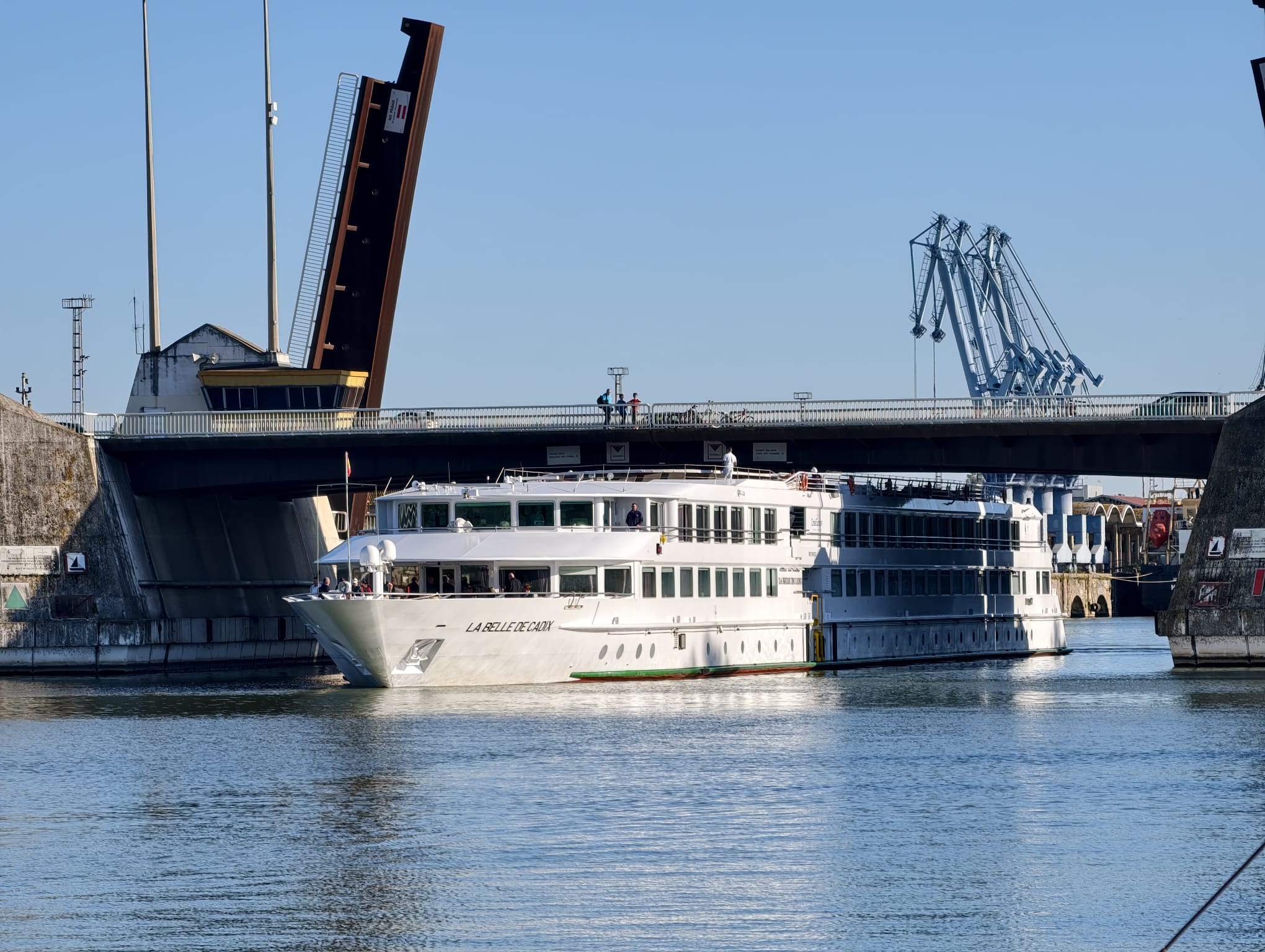 When we’re having dinner in the cockpit, this cruise ship passes under the bridge. They have to fold everything down and the people on the upper deck have to dive down, but they don’t need to open the bridge. ๐
