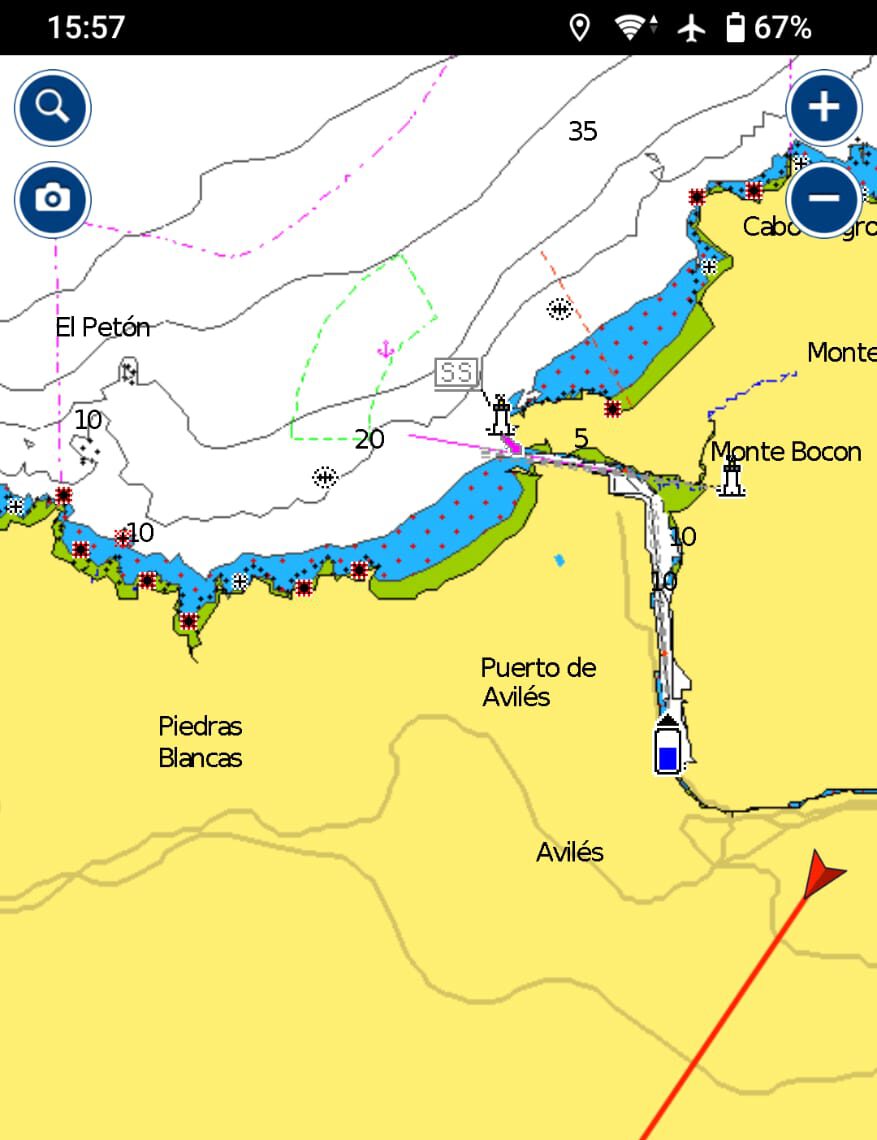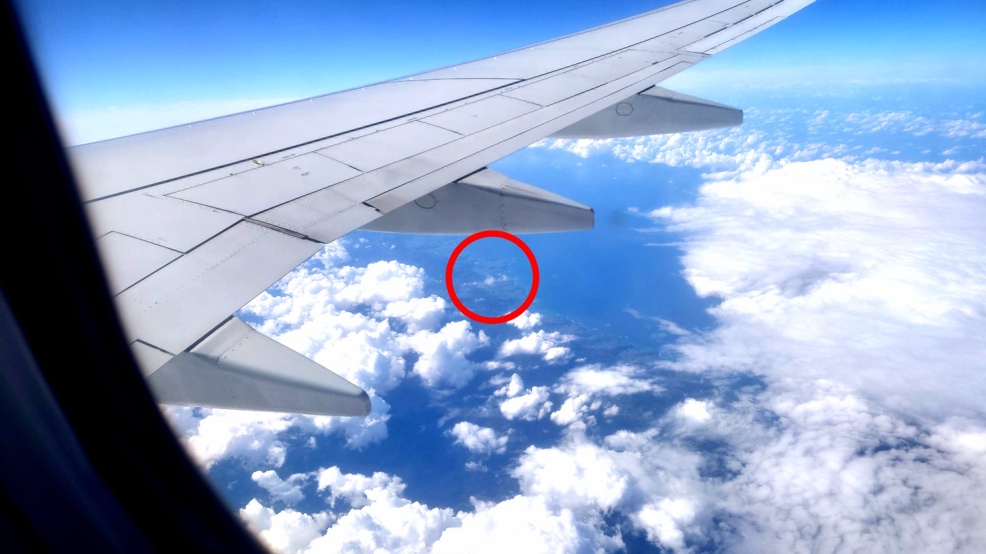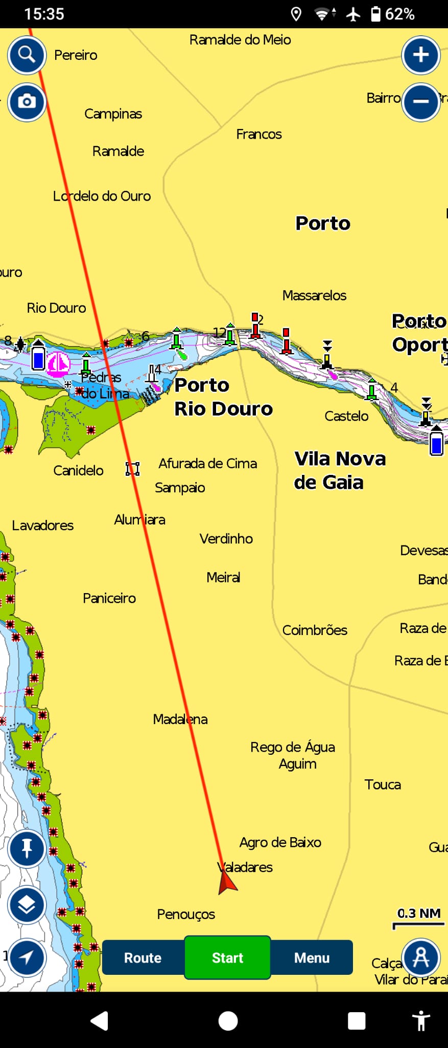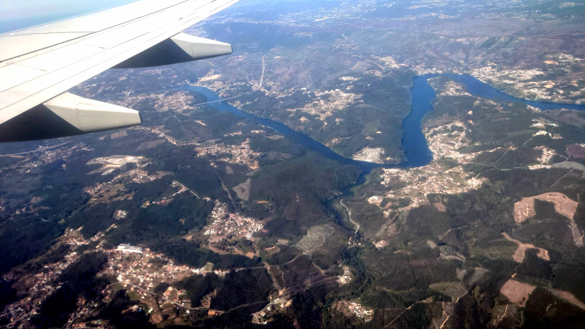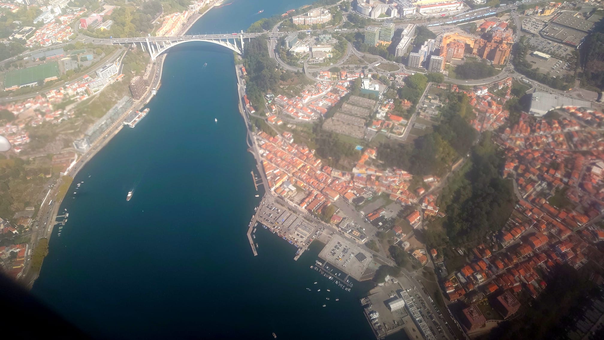 Then it’s time to head back home. Looking down, we can just see the stern of Dione IV ๐ (in the red circle) as we fly over Porto on our final landing approach.